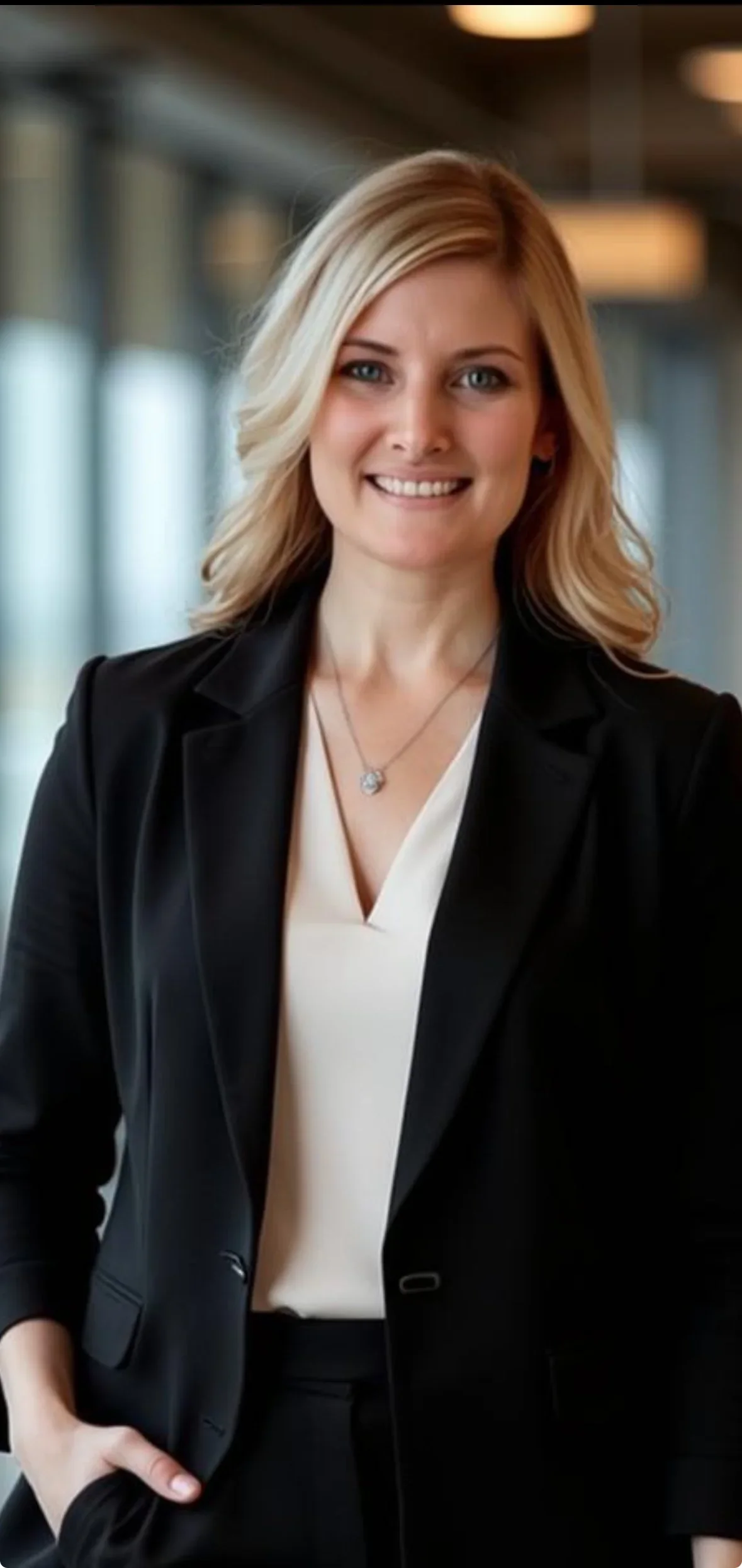 A professional woman with blonde hair wearing a black blazer and white blouse, smiling in an indoor office or corporate setting.